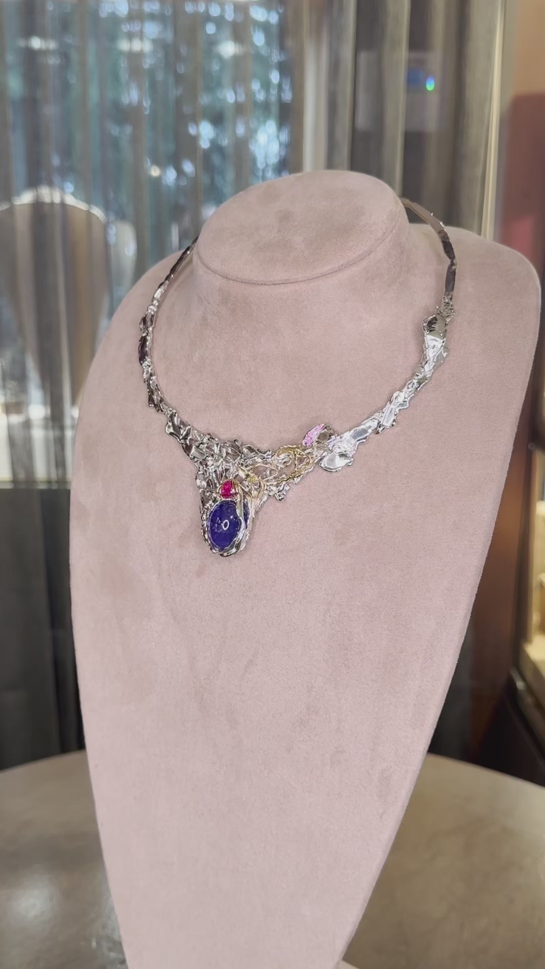 Materiali di eccellenza utilizzati: Argento Silnova®, finiture in oro giallo 18kt, Tanzanite cabochon, Tormalina rossa cabochon e Rubini.